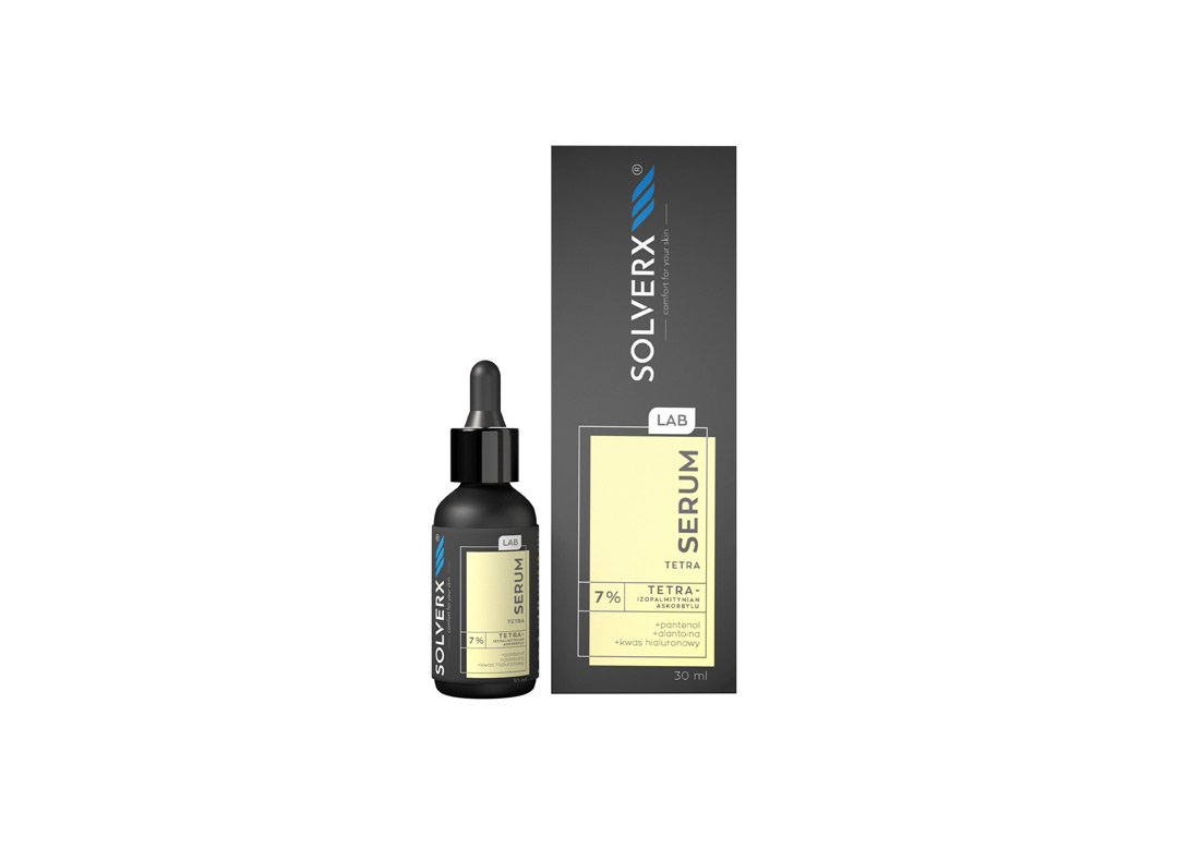 SOLVERX LAB 7% Tetra Serum 30ml Glow bez kompromisów. Nowość Serum działa kompleksowo: rozświetla skórę, wyrównuje jej koloryt i wspiera regenerację, poprawiając jędrność i elastyczność. Zawiera najbardziej stabilną, najlepiej przebadaną i najbardziej przyjazną dla skóry formę witaminy C – Tetraizopalityniam askorbylu, jest rozpuszczalna w tłuszczach, a dzięki temu łatwej przenika do kolejnych warstw skóry niż inne pochodne kwasu askorbinowego. Działa silnie antyoksydacyjnie. Serum zapewnia aksamitne wykończenie bez efektu tłustości dzięki zastosowaniu nowoczesnych, suchych emolientów.