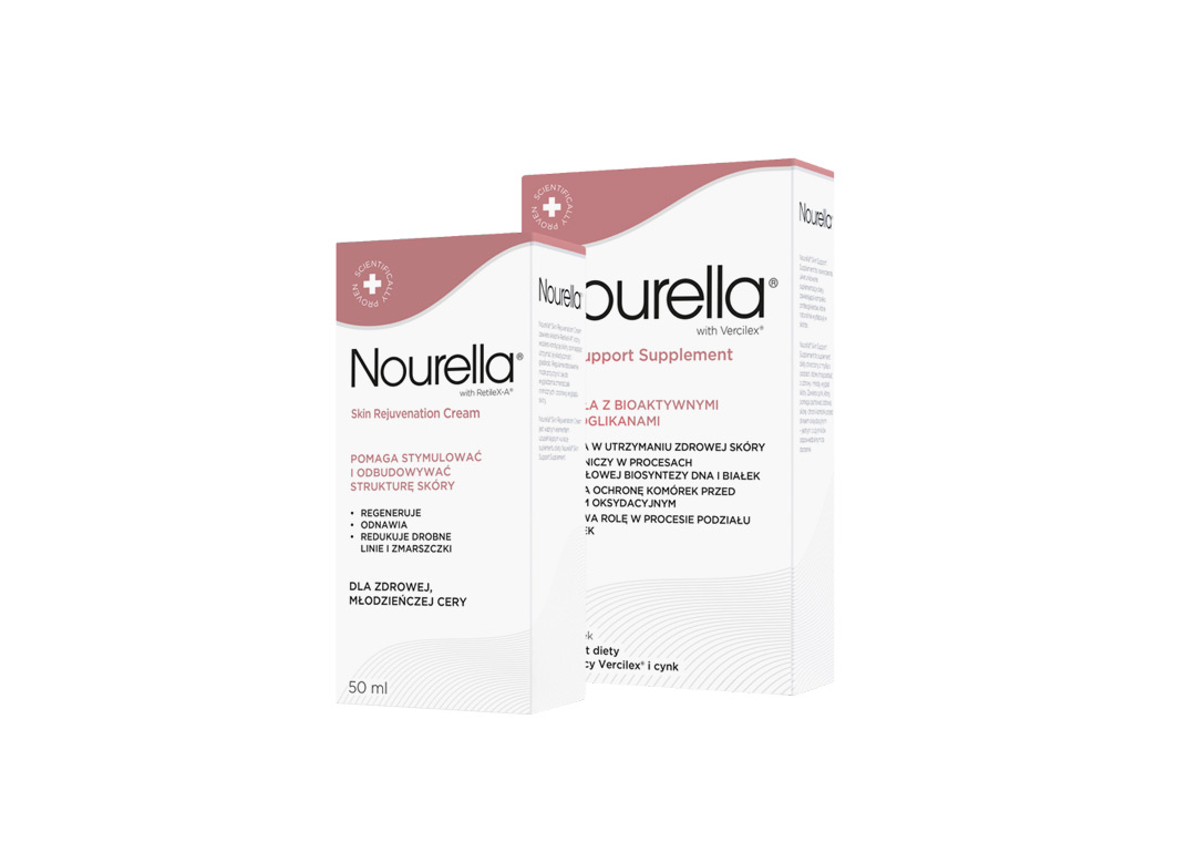 Podwójna siła regeneracji – od wewnątrz i od zewnątrz. Suplement diety zawiera Vercilex® - opatentowany kompleks proteoglikanów (w tym Decorin, Versican, Biglycan), który wykazuje wysoką biodostępność i zdolność do odbudowy macierzy zewnątrzkomórkowej skóry. Krem z RetileX-A®- technologia, która zapewnia 300-krotnie lepszą penetrację retinoidów bez podrażnień. Bezpieczny nawet dla skóry wrażliwej. Duet aktywnie wspiera procesy odnowy skóry. Rewolucyjna terapia proteoglikanowa w połączeniu z retinoidową nanotechnologią przywraca skórze jędrność, gęstość i blask.